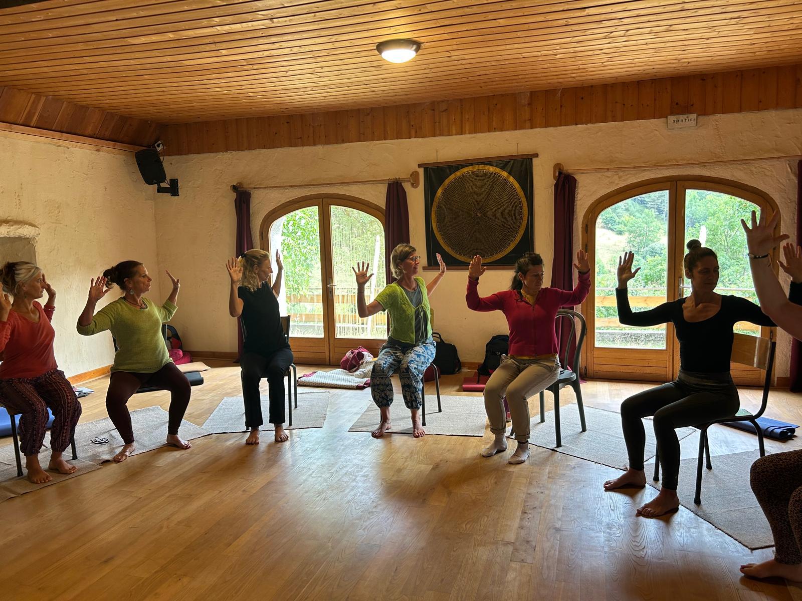 Les postures restent accessibles, mais grâce à des accessoires. Par ailleurs, l’utilisation des mudras, les gestes des mains, du chant, l’utilisation d’une certaine respiration, va amener de la densité, de la diversité dans la pratique.